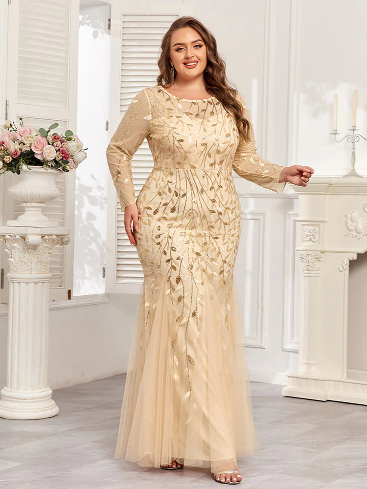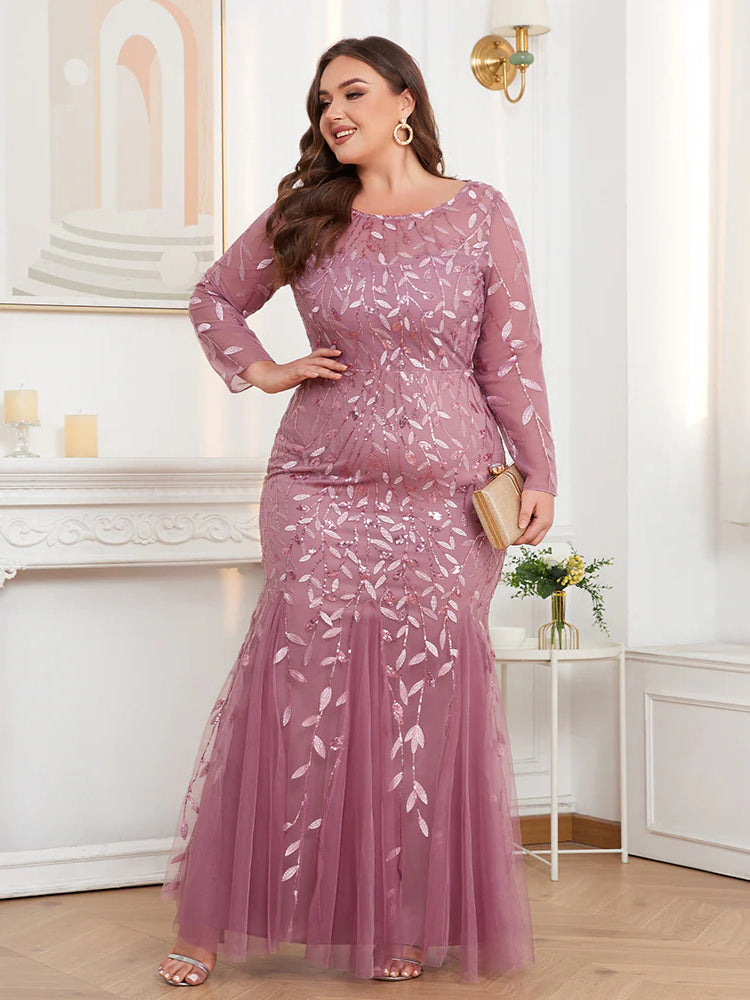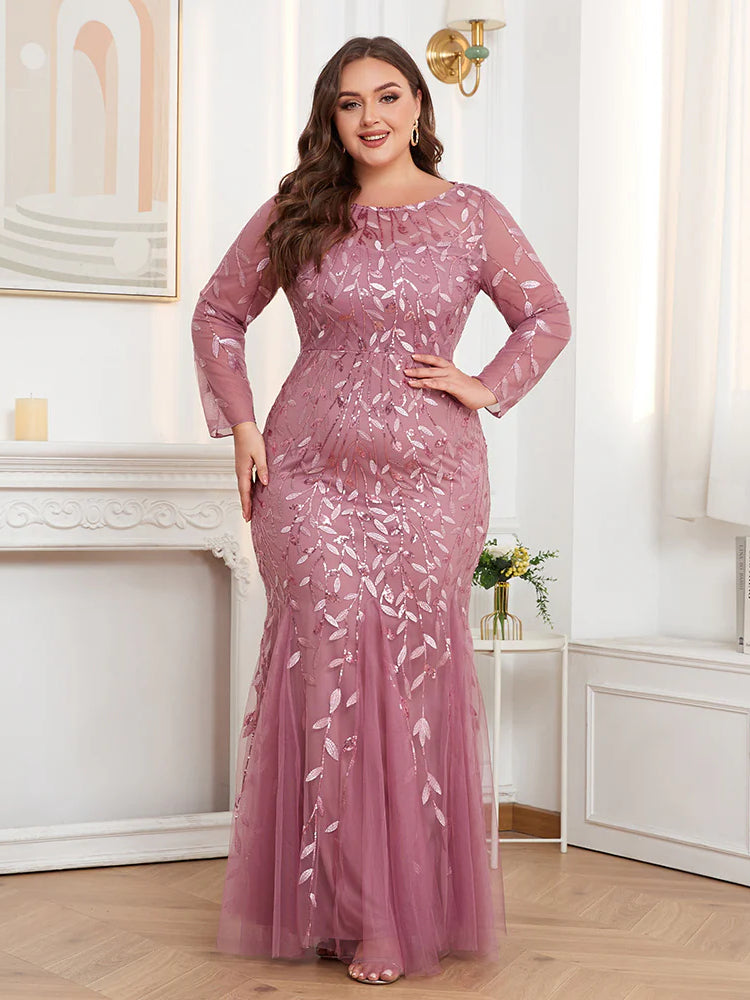 • Large Size Crew Neck Embroidered Long Sleeve Fishtail Evening Dress