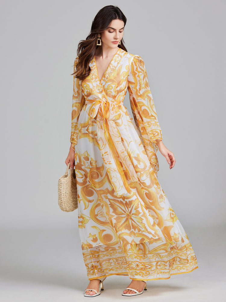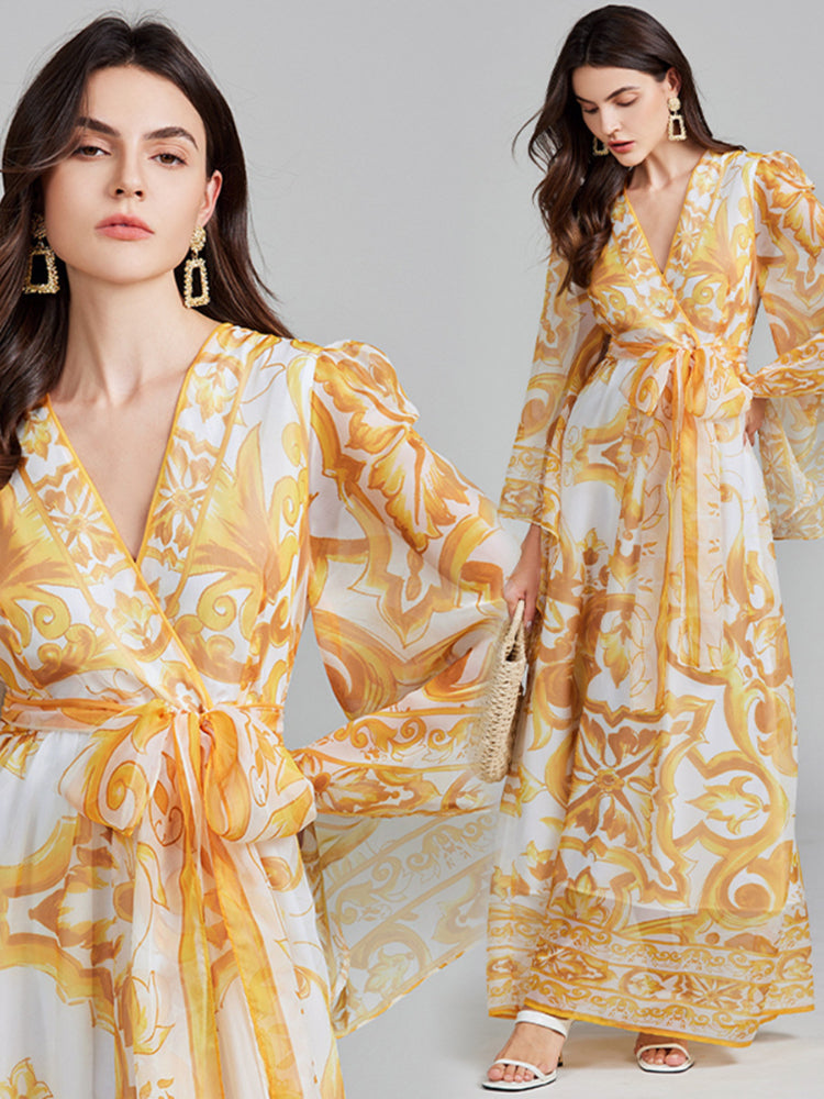 • Light luxury horn sleeve V-neck blue and white porcelain dress