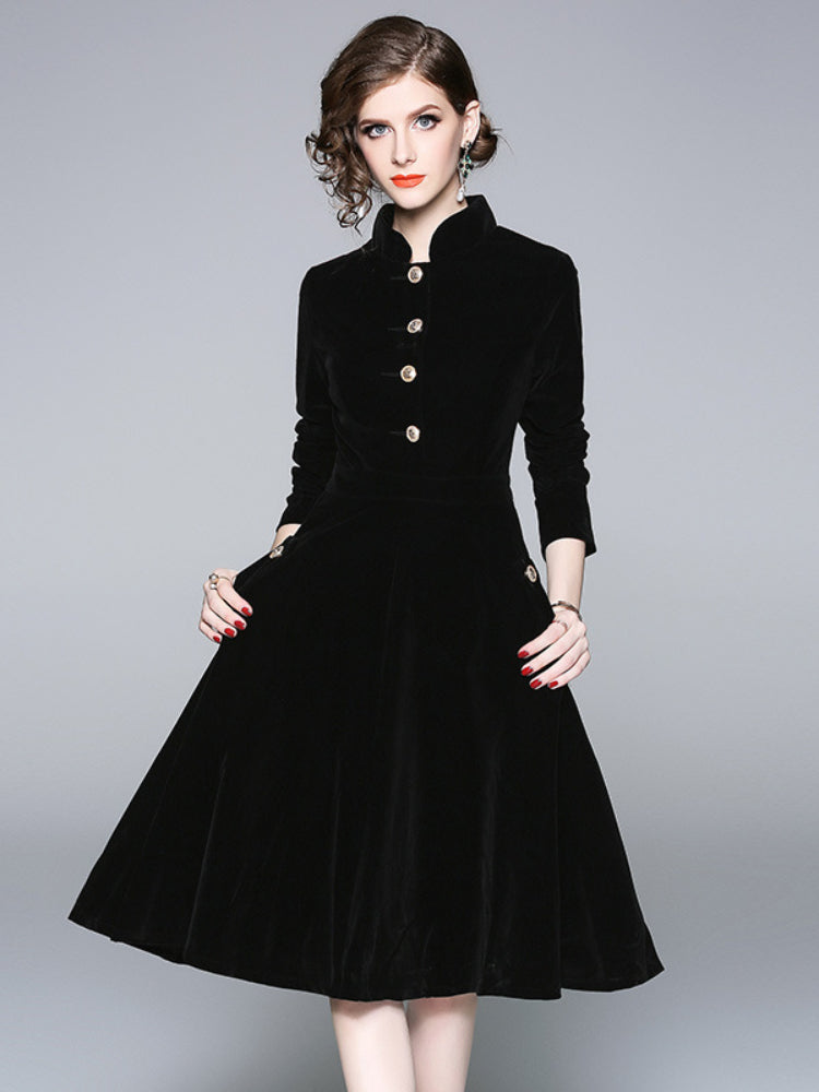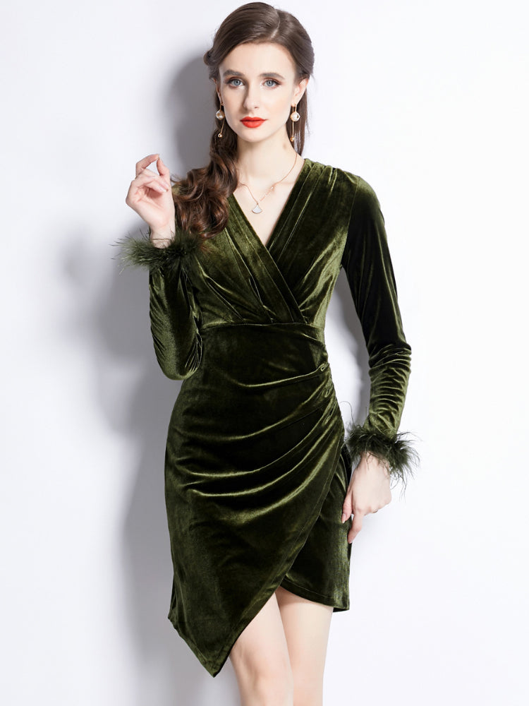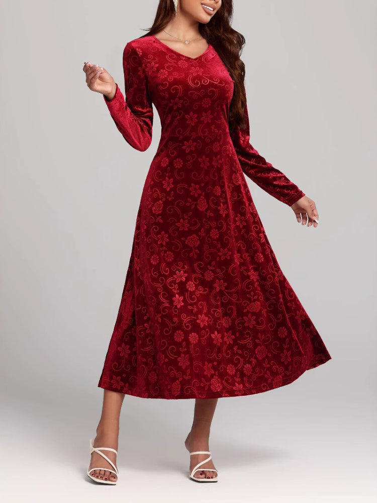 Fashion Velvet Print V-Neck Long Sleeve Dress